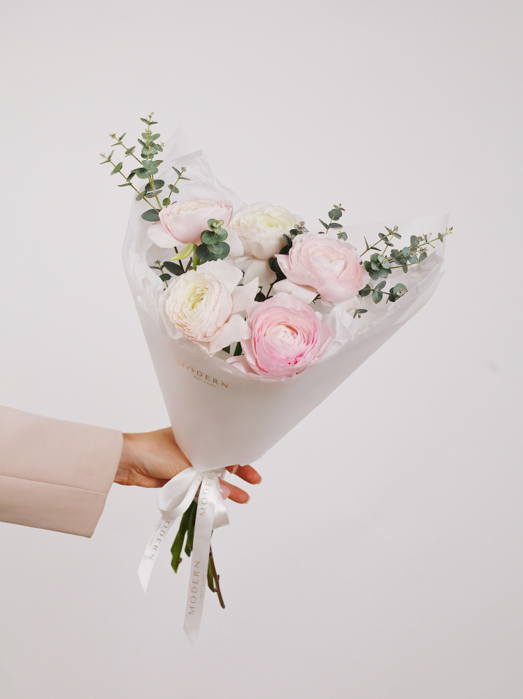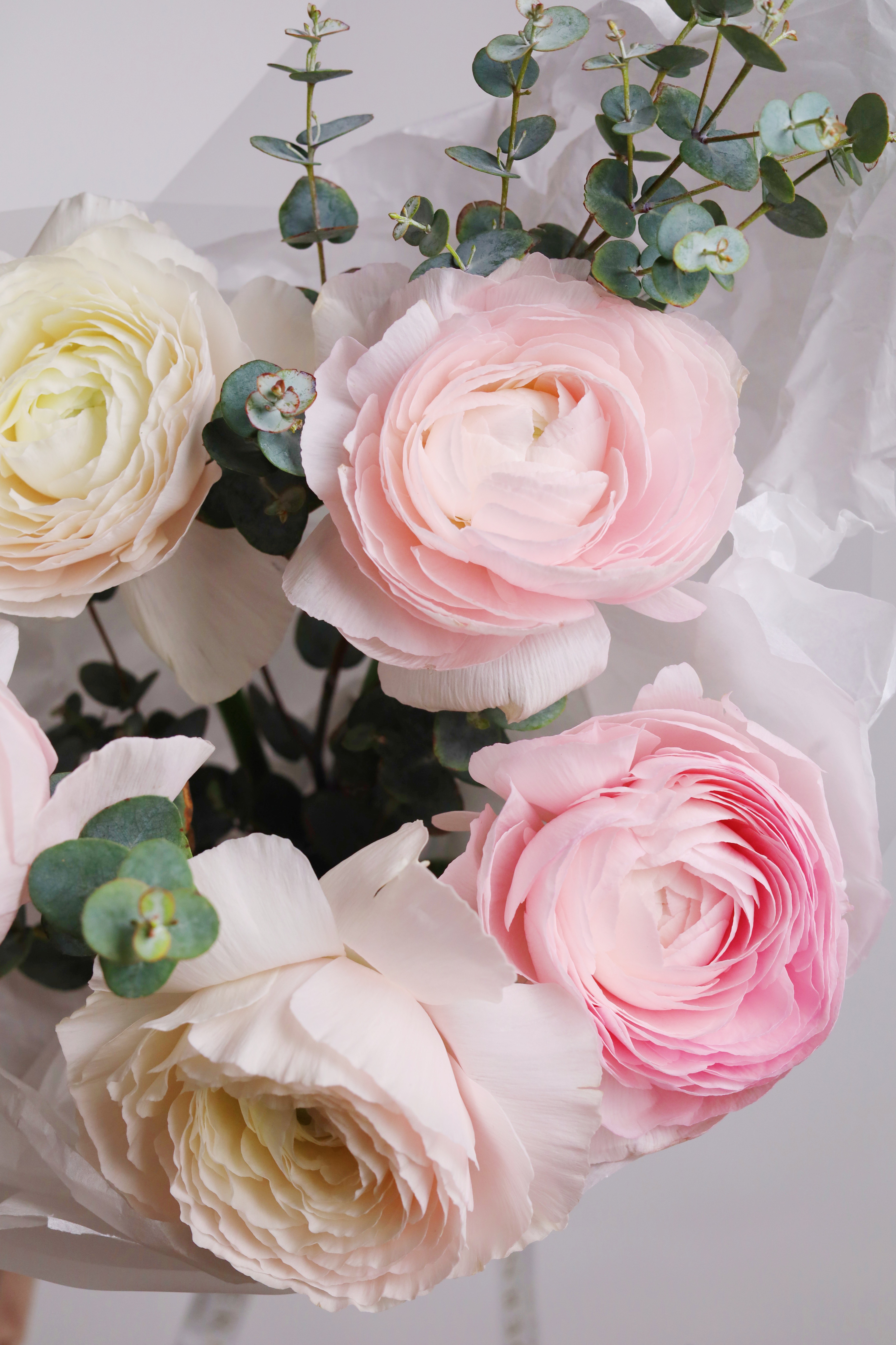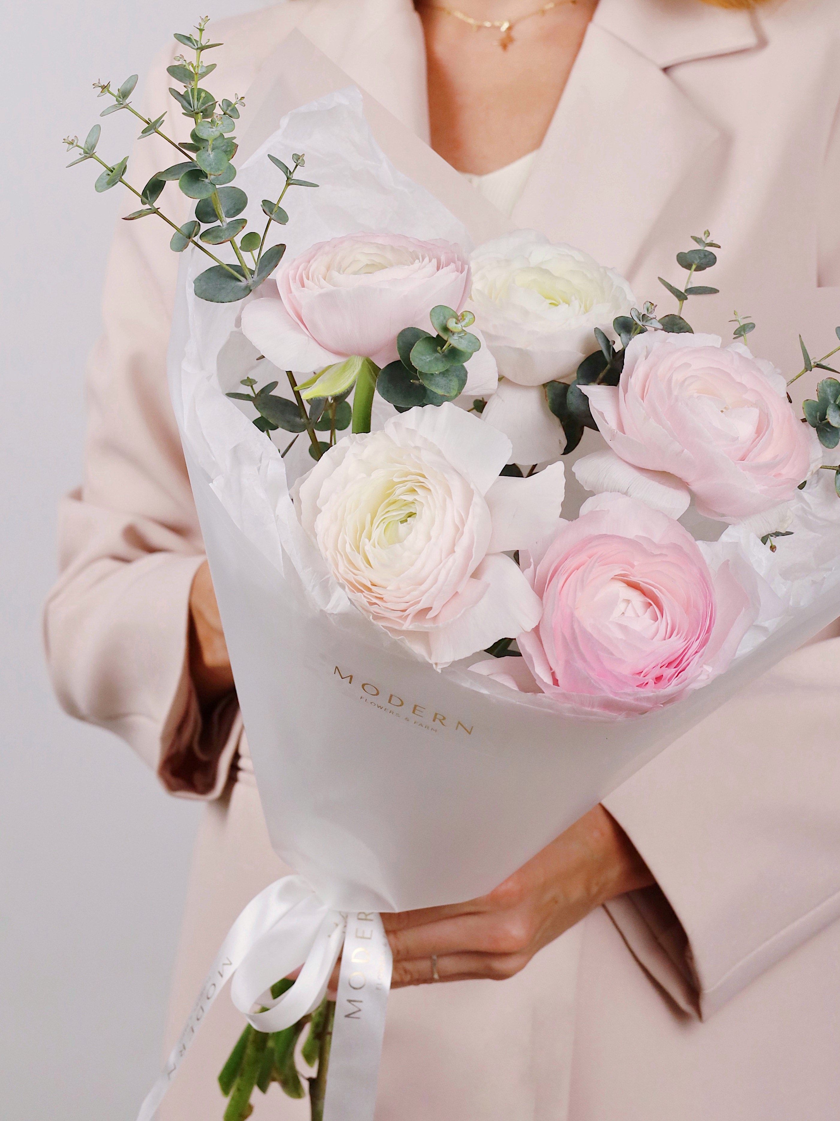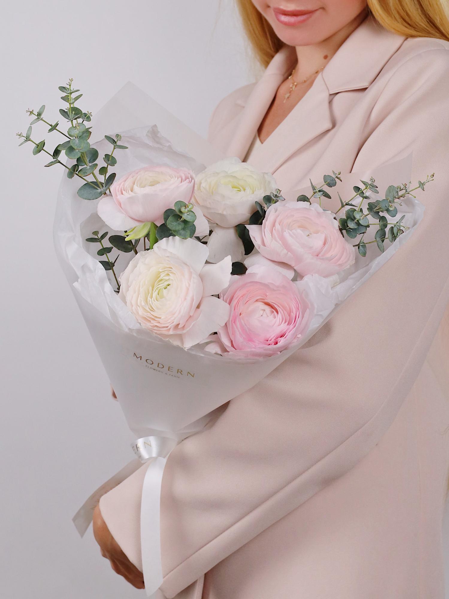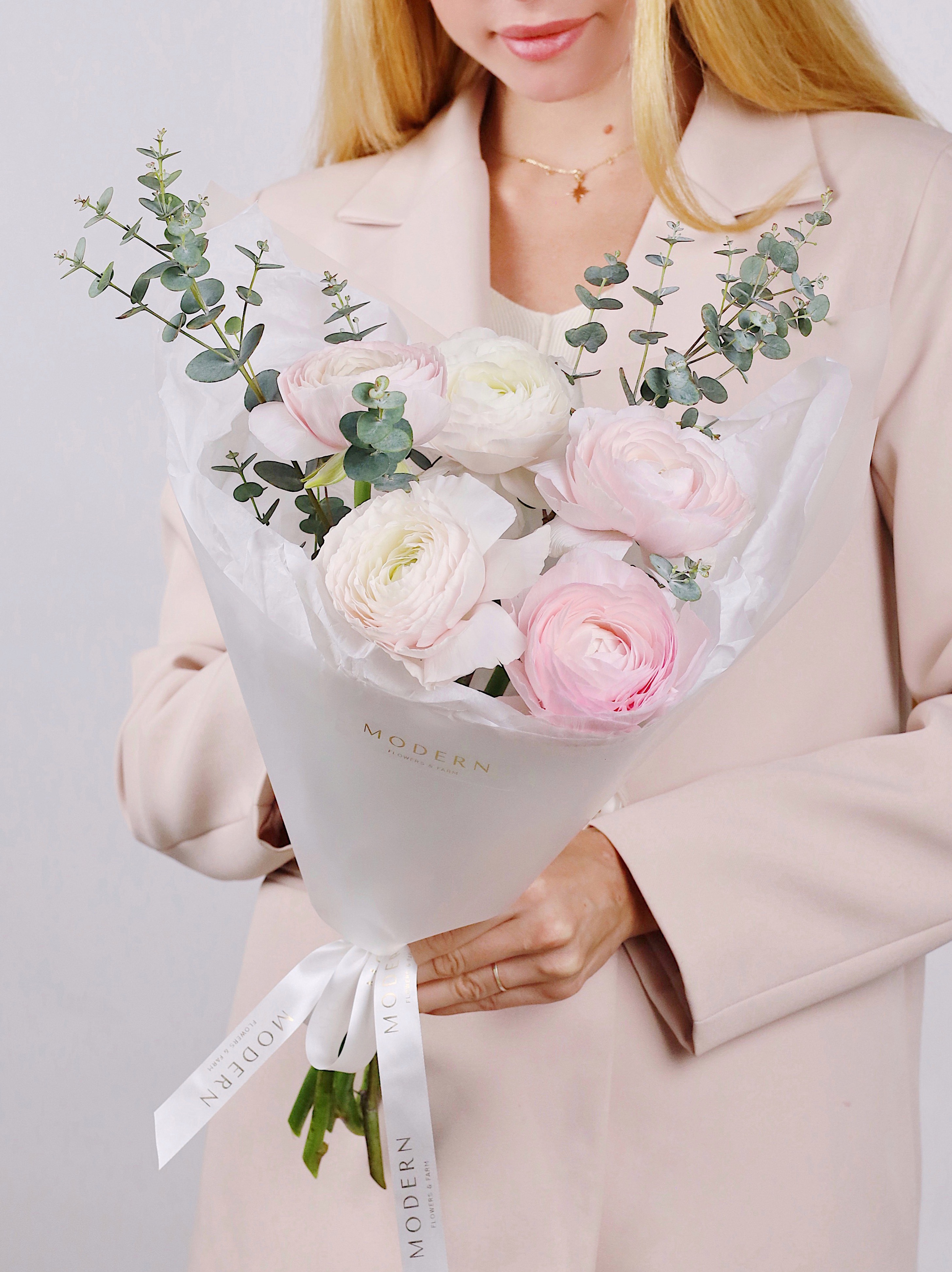 БУКЕТ ИЗ РАНУНКУЛЮСОВ 5 ШТ И ЭВКАЛИПТА