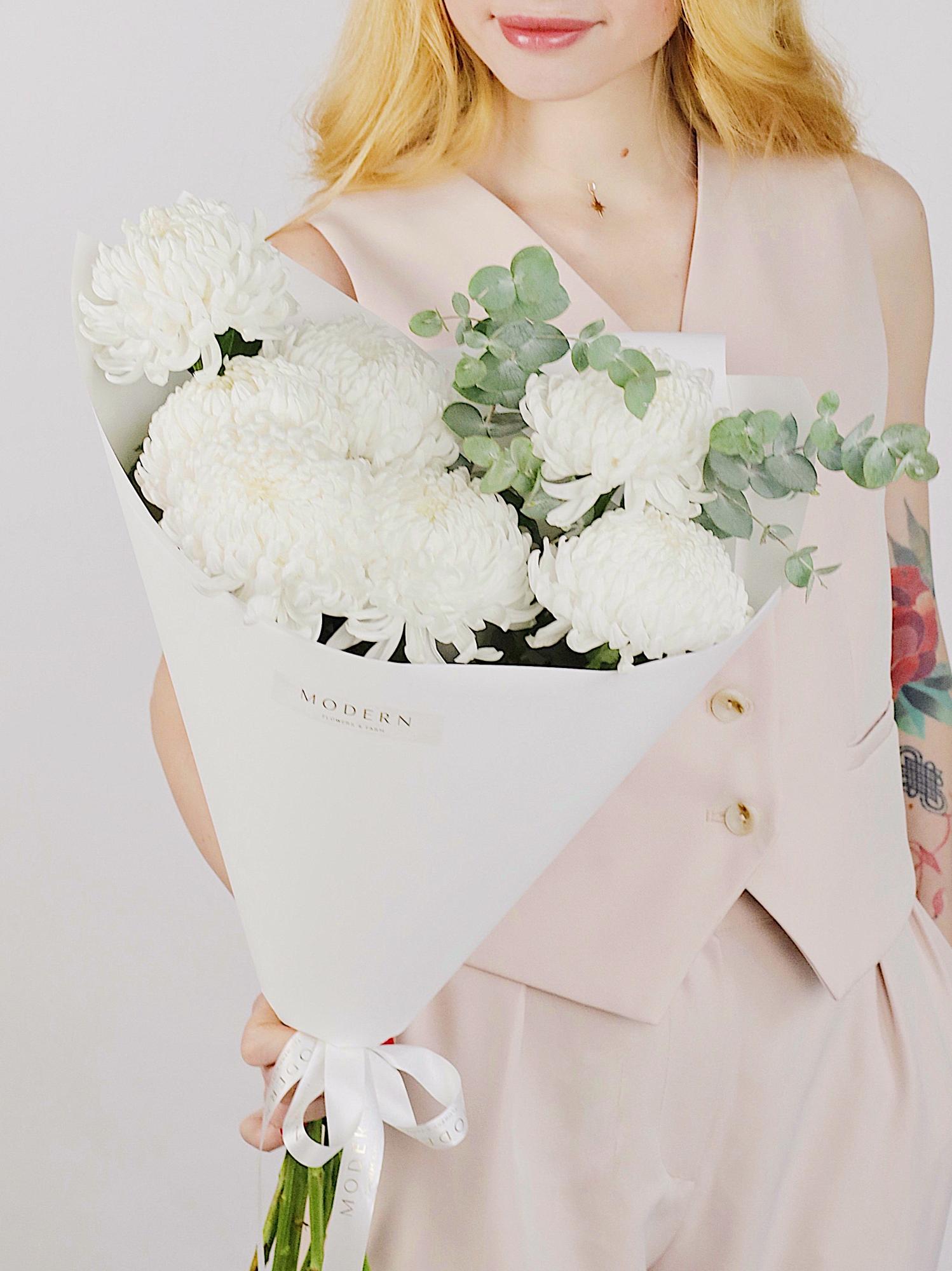 БУКЕТ С БЕЛОЙ ХРИЗАНТЕМОЙ И ЭВКАЛИПТОМ