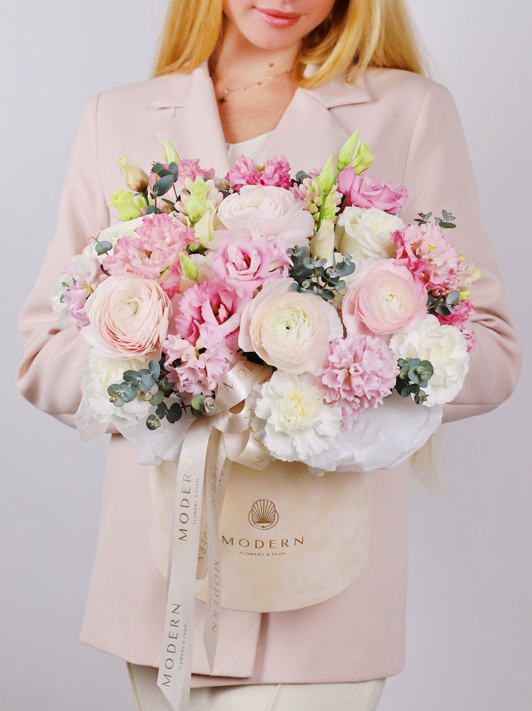В композиции цветы расположены на флористической губке, хорошо сохраняющей воду и крепко удерживающей подрезанные растения, благодаря чему, букет не потеряет форму. Эустомы в корзинах и шляпных коробках нужно регулярно поливать и убирать подсохшие листья.