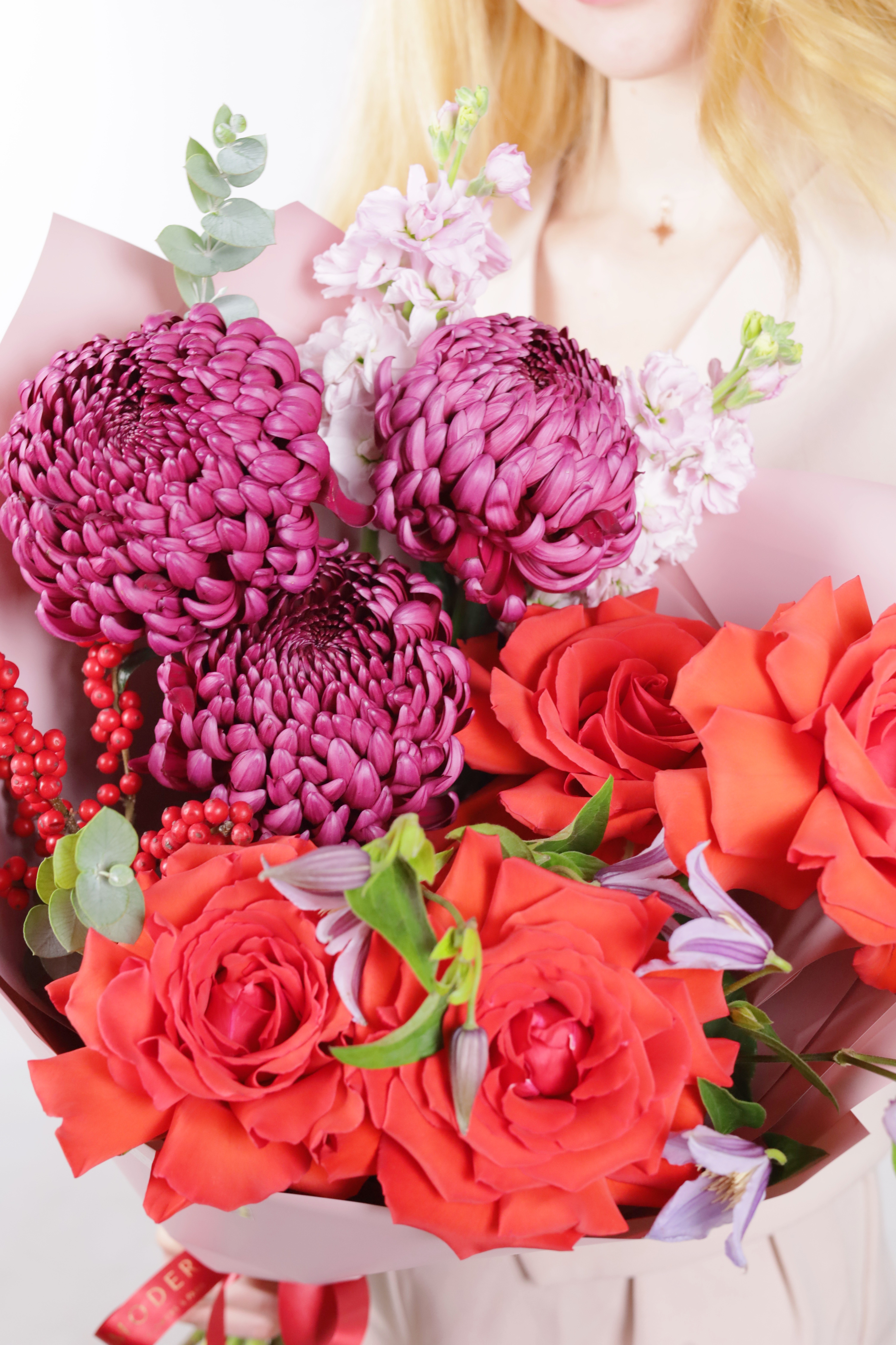 —ЯРКИЙ БУКЕТ С ХРИЗАНТЕМОЙ, ИЛЕКСОМ И ФРАНЦУЗСКОЙ РОЗОЙ